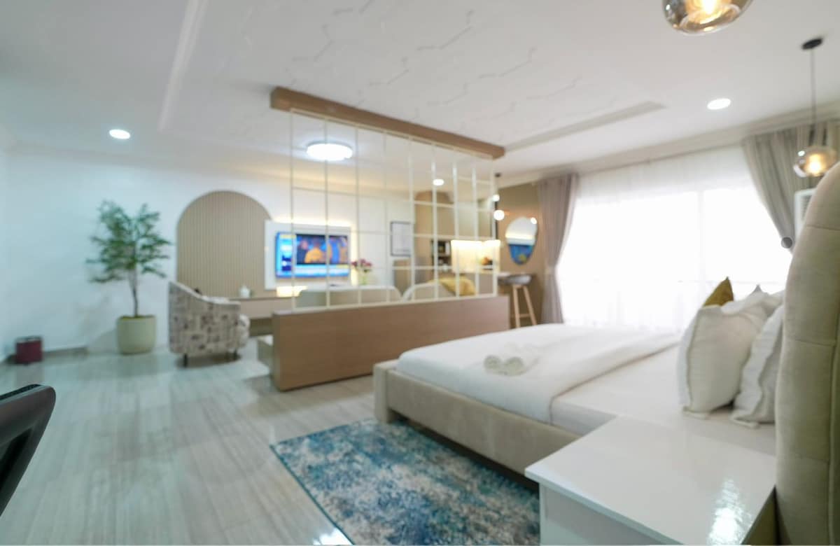 Escape the hustle of the city in this spacious, stylish studio apartment. The contemporary aesthetic of this space is perfect for couples’ getaways or solo travellers It is fully furnished + located in a secure estate. The space is serviced with free, super-fast Wifi & ample parking space The kitchen is fitted with modern equipment for your convenience. With 24/7 electricity, our smart TV & other luxurious amenities make this a home away from home, with the trappings of a dreamy hotel suite.