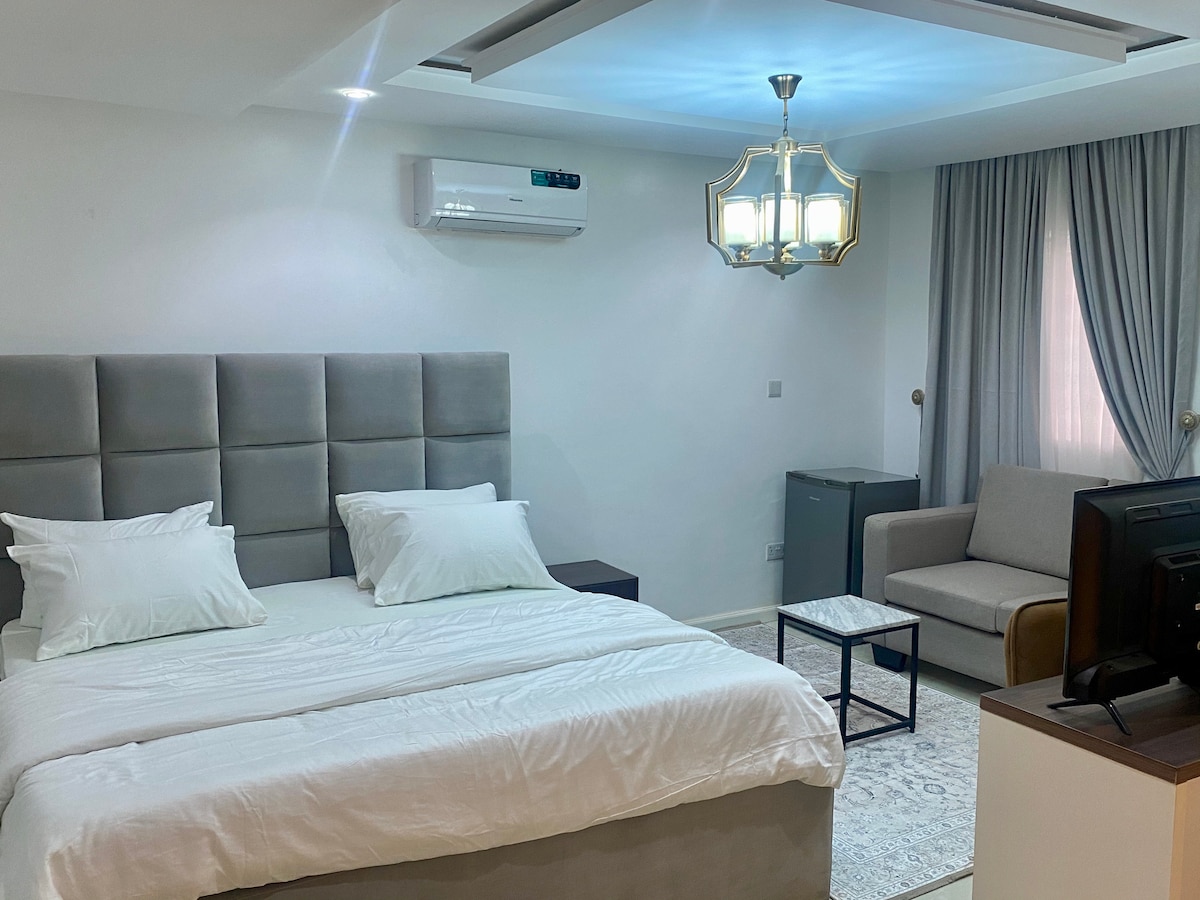 This is a privately owned, redesigned executive 1 bedroom with kitchenette located inside a full-service highly secured hotel in Garki II, with the privacy & comfort of your own apartment-style space, perfect for business travellers, families & extended stays. Enjoy premium amenities such as; Swimming pool Private balcony & exterior Patio Fully equipped gym On-site restaurant High-speed WiFi, Netflix & DSTV 24/7 power supply & AC Daily housekeeping 24/7 security & CCTV Lift access