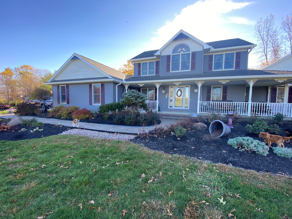 Forget your worries in this spacious and serene space. Serenity Awaits YOU in this cozy country wooded setting. Amenities in this full 1550 square foot basement include a gas fireplace, billiard table, exercise machines, in-ground heated pool, 1/4 acre pond, hot tub, fire pit, outdoor seating, wooded area to explore, coffee bar, games, kitchenette, queen bed, and 2 TVs!! Home away from home with luxury.