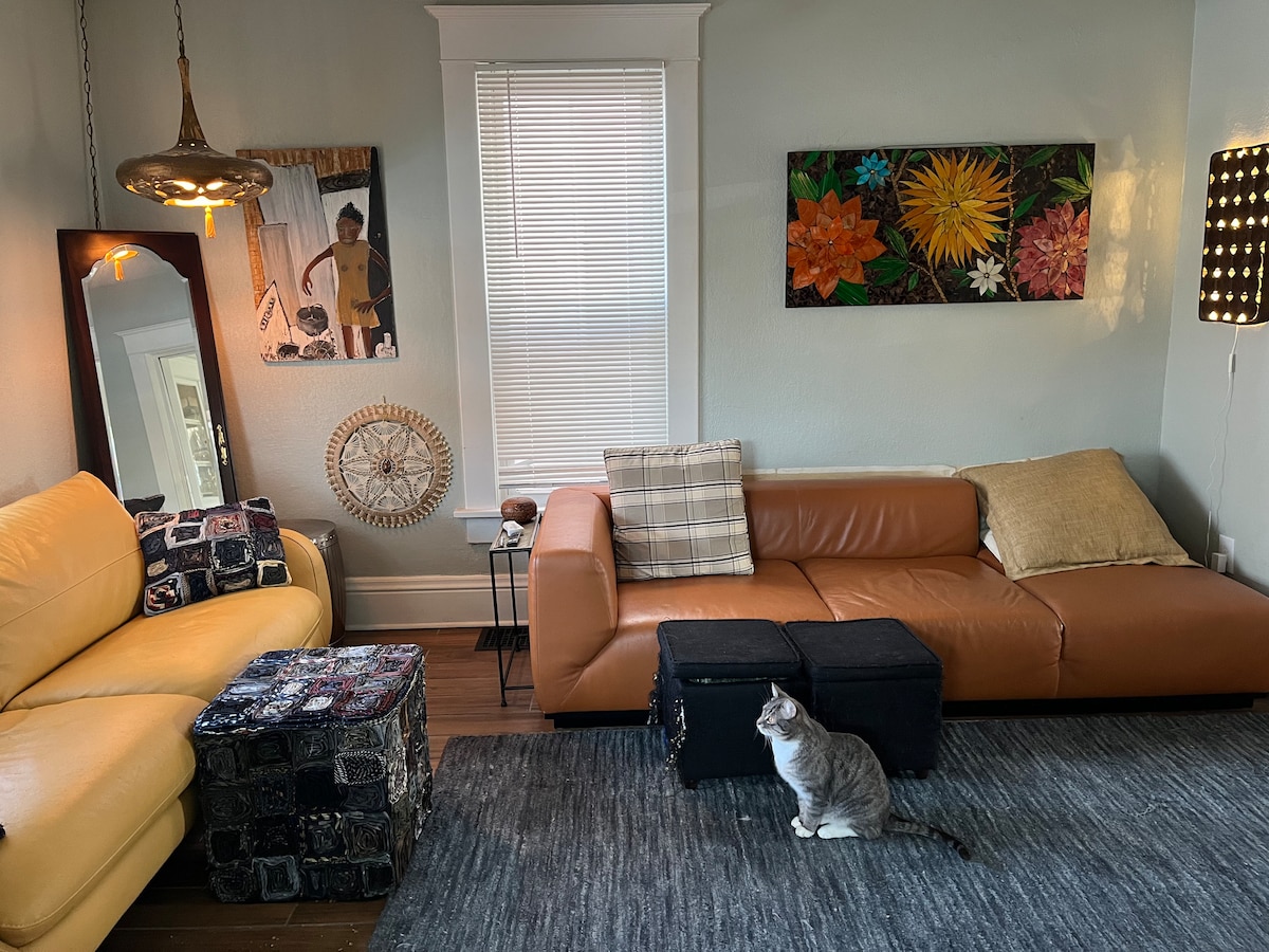 Private boutique suite situated in a historical 1880s building, featuring a large open layout, 12ft ceilings, 1200sqft one bedroom, one office, one bathroom loft, ground level, full of locally sourced antiques and accessories. 12 minutes from GEHA stadium. Minutes away from Union Station, Downtown, Legends & West bottoms and everything fun to do in KC! Recently updated, very quiet and peaceful! large patio area with grill, chairs and firepit included with your stay. (Please note, not for locals)