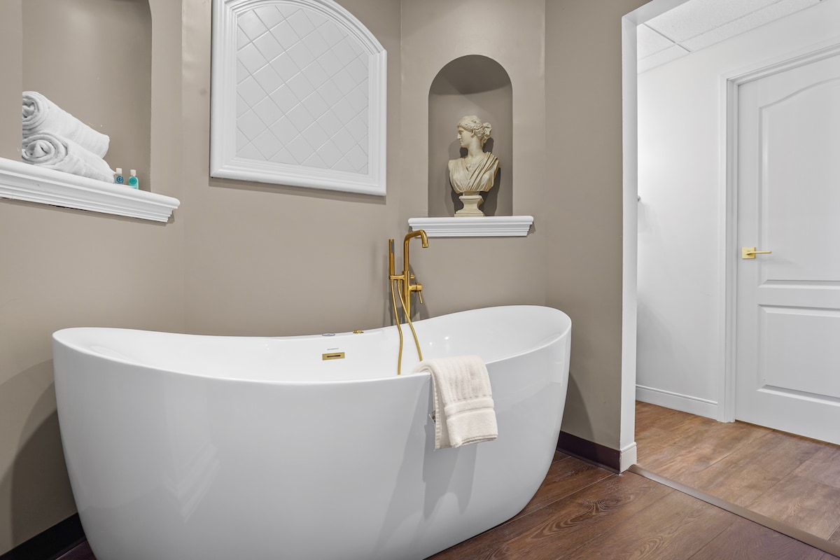 Indulge in comfort and relaxation in our Deluxe Spa Suite, a relaxing retreat designed for guests who want a little extra luxury during their stay. This suite blends modern style with soothing spa-inspired touches, creating the perfect atmosphere to unwind. The room features a plush Queen size bed, a sitting area, and a large window that fills the space with natural light. This room also features our new jetted tub with inline heaters. Please note this room does not have a shower.