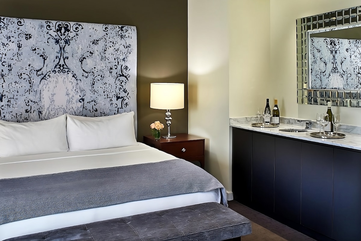 Step into timeless elegance in our Hemingway Suite, where classic luxury never goes out of style. Curl up by the oversized fireplace at the foot of your bed, soak in the grand jetted tub, & bask in natural light pouring through massive window that frames a view as inspiring as a Hemingway novel. With refined, elegant design that whispers sophistication, this suite is perfect for those who crave a stay that’s both romantic and unforgettable... because true style, like a great story, never fades.