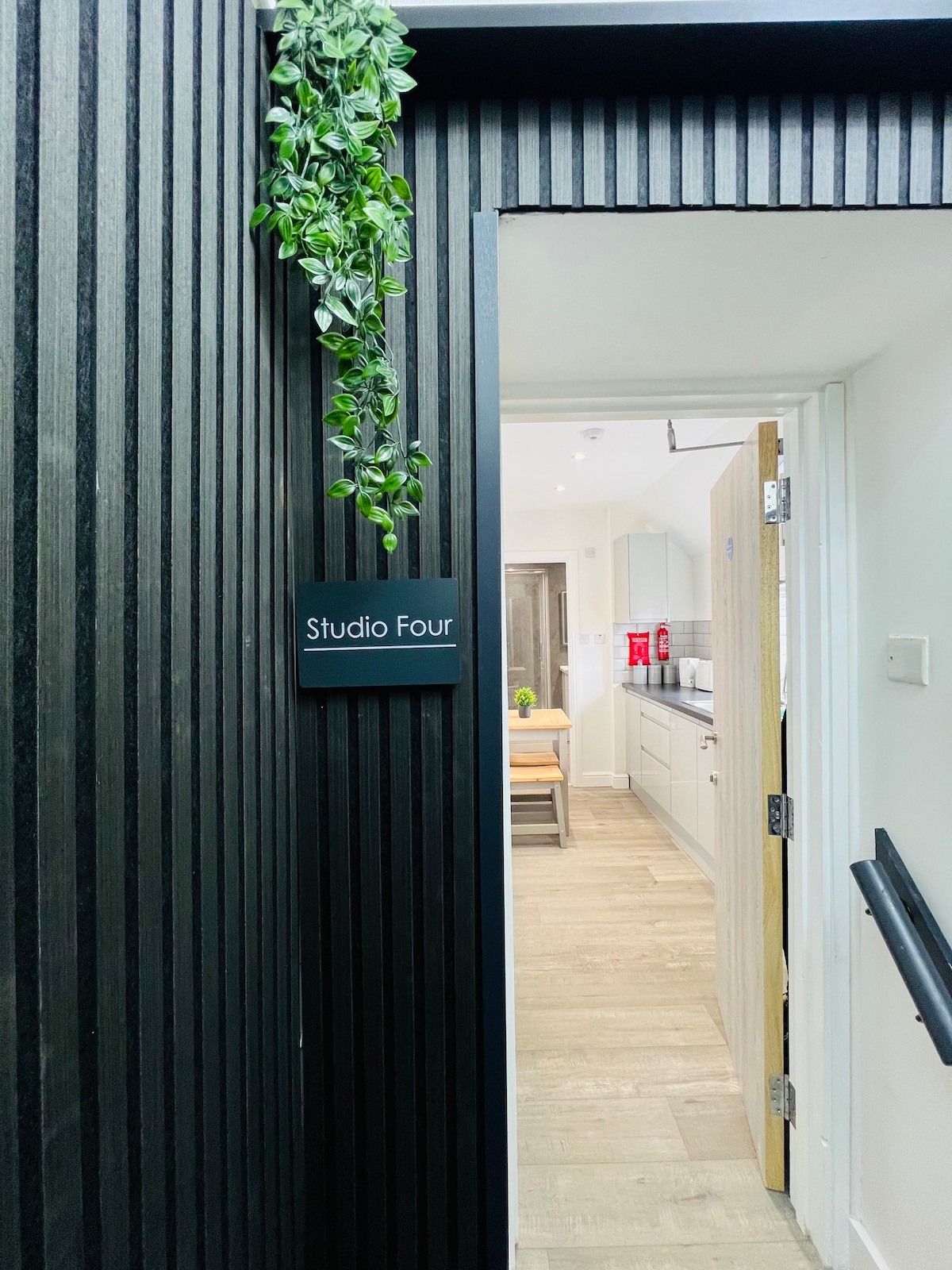 Our self-contained ground floor studio apartment is for two and is one of two units . It offers a comfortable retreat, workspace, or base for exploring. The kitchenette has a fridge, microwave, hot plate, toaster, and mini-oven for convenient meal & drink preparation. Enjoy a modern bathroom with an electric shower. Relax with a king-size bed, sofas, table & chairs and a log burner for cold nights. The studio has a private entrance through a shared corridor with the upstairs apartment.