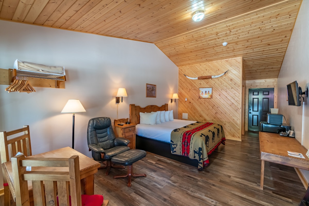 This rustic style hotel room offers fantastic accommodations to meet your needs in an even better location. Decorated with historic photos of Jackson Hole and furnished with Old Hickory and Knotty Pine you'll feel like you're part of the Old West.