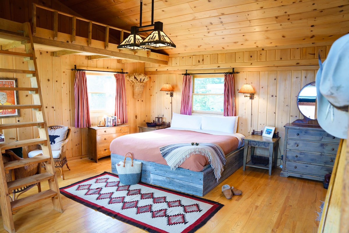 Named after famous artist and previous resident Ivan Albright, this cabin was once Ivan's painting studio. Take a soak and watch the sunset as our local elk heard croon a bugle tune. With expansive views of the Wind River Valley, Albright Cabin features a king size bed, couch, mini bar, vintage claw foot soaking tub.