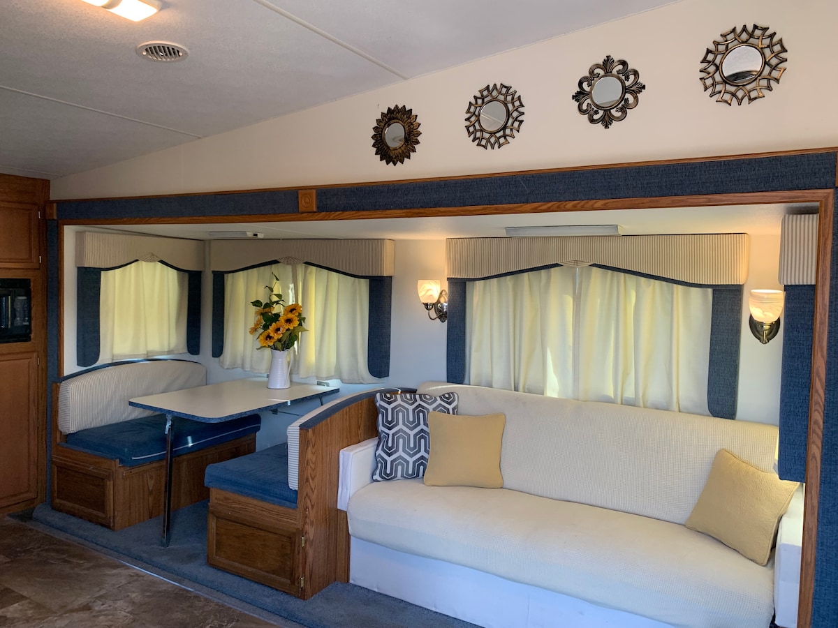 This luxury RV takes Glamping to a whole new level! Come enjoy this equestrian property with its many features. 10 acres to roam around, horses everywhere! Fish, swim, rent a bike, or just relax by the river sitting in the romantic gazebo. With end of road privacy, pure tranquility awaits the travelers who want to find peace and relaxation in this beautiful sanctuary. Within walking distance is the quaint Hallmark town of Dayton with its Historic Main Street. NON SMOKERS ONLY.