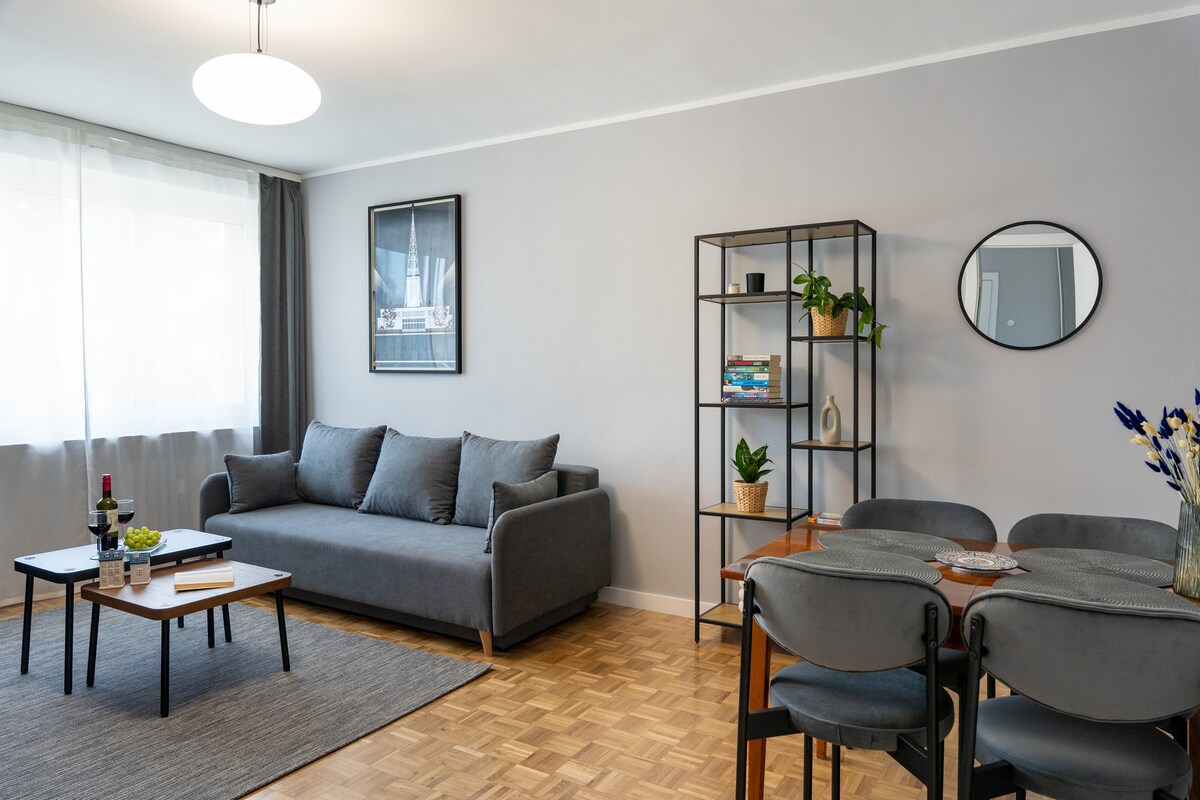 The apartment with a balcony will be perfect for a couple, 3 or 4 people. Consists: hall, a living room with a kitchenette and a dining area equipped with the necessary appliances, a bedroom and a bathroom with a shower and washing machine. In the living area you will find a comfortable sofa and flat-screen TV. The bedroom has a large and comfortable bed 160x200. The apartment has a Wi-Fi connection and a place for remote work. The apartment comes with a parking space in the underground garage.