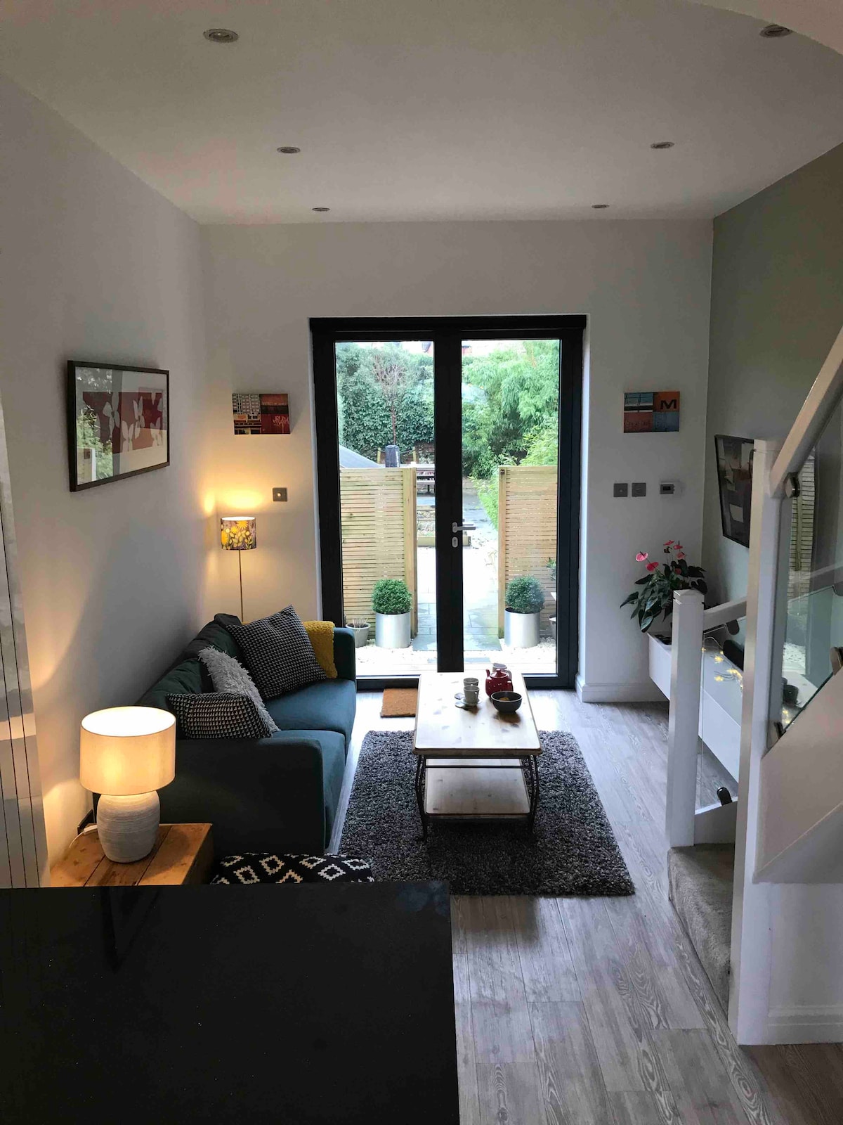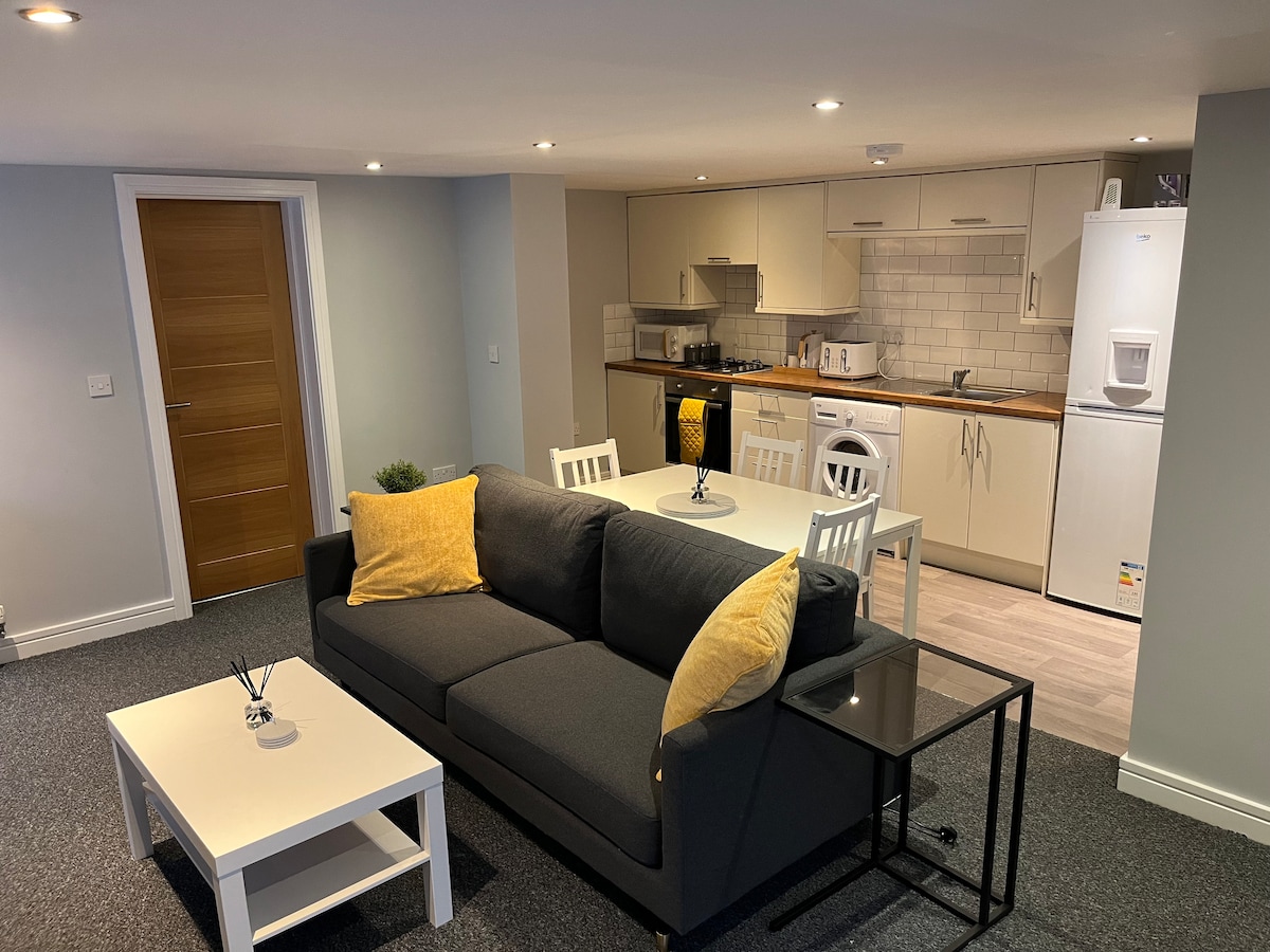 This is a newly refurbished one bedroom, ground floor apartment, with private driveway and back garden area. The building is located in the heart of Cheadle. Very close to shops, restaurants, pubs and public transport. 10 minutes to Manchester Airport and 20-25 minute drive to Manchester City. The apartment has 1 freshly decorated bedroom featuring a comfortable double bed. The spacious open plan living/kitchen area has a sofa bed - suitable for 2 adults, however, it is a small double bed.