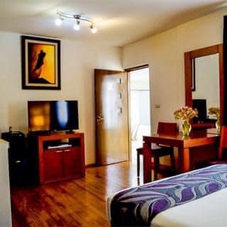 Esta habitación cuenta con una área muy amplia y sillones reclinables. Tiene una ducha muy grande y confortable. Ofrecemos batas de toalla de baño y de descanso por si requiere. Cuenta también con caja fuerte. Puede tomar masajes relajantes, descontracturantes con un precio adicional. La habitación es muy cómoda y bonita, tiene una televisión de 65" smart TV, cafetera, desayunador y servicio completo, frigobar con distintos productos comerciales. Contamos con tours en toda la región.