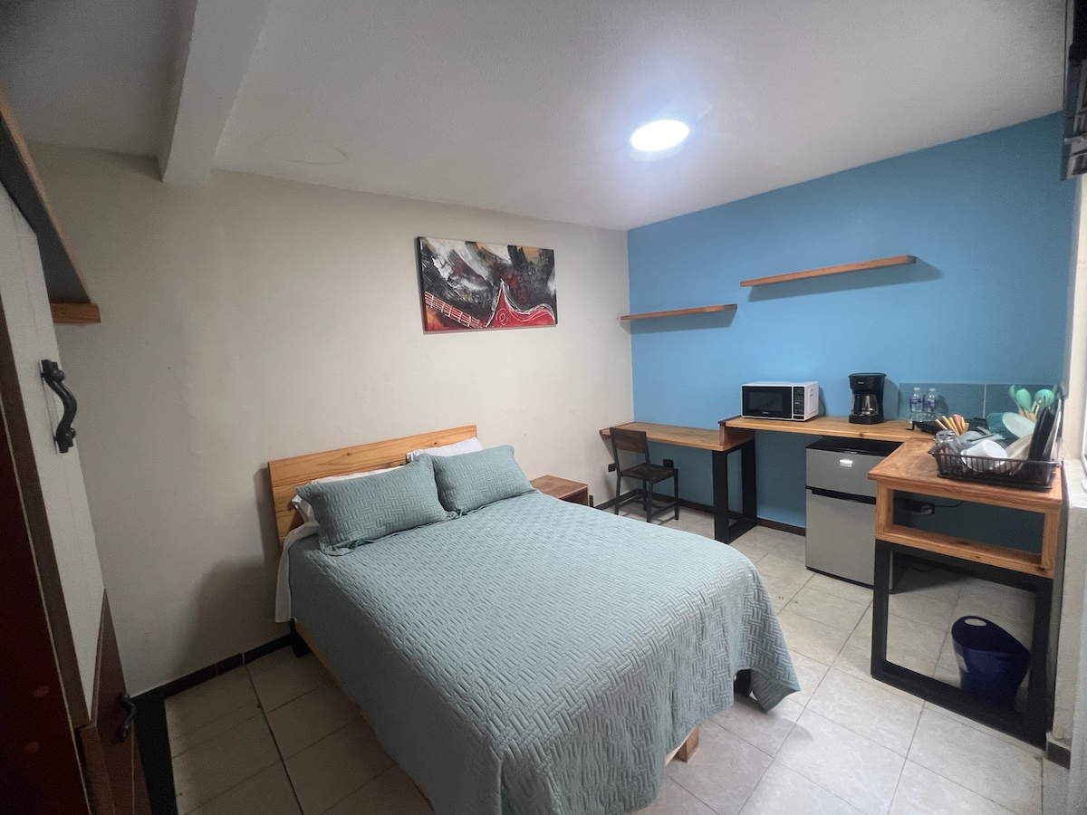 pequeña y comoda habitacion muy cerca del centro , cuenta con lo necesario para estancias vacaciones, trabajo ; mucha limpieza , sencilla economica