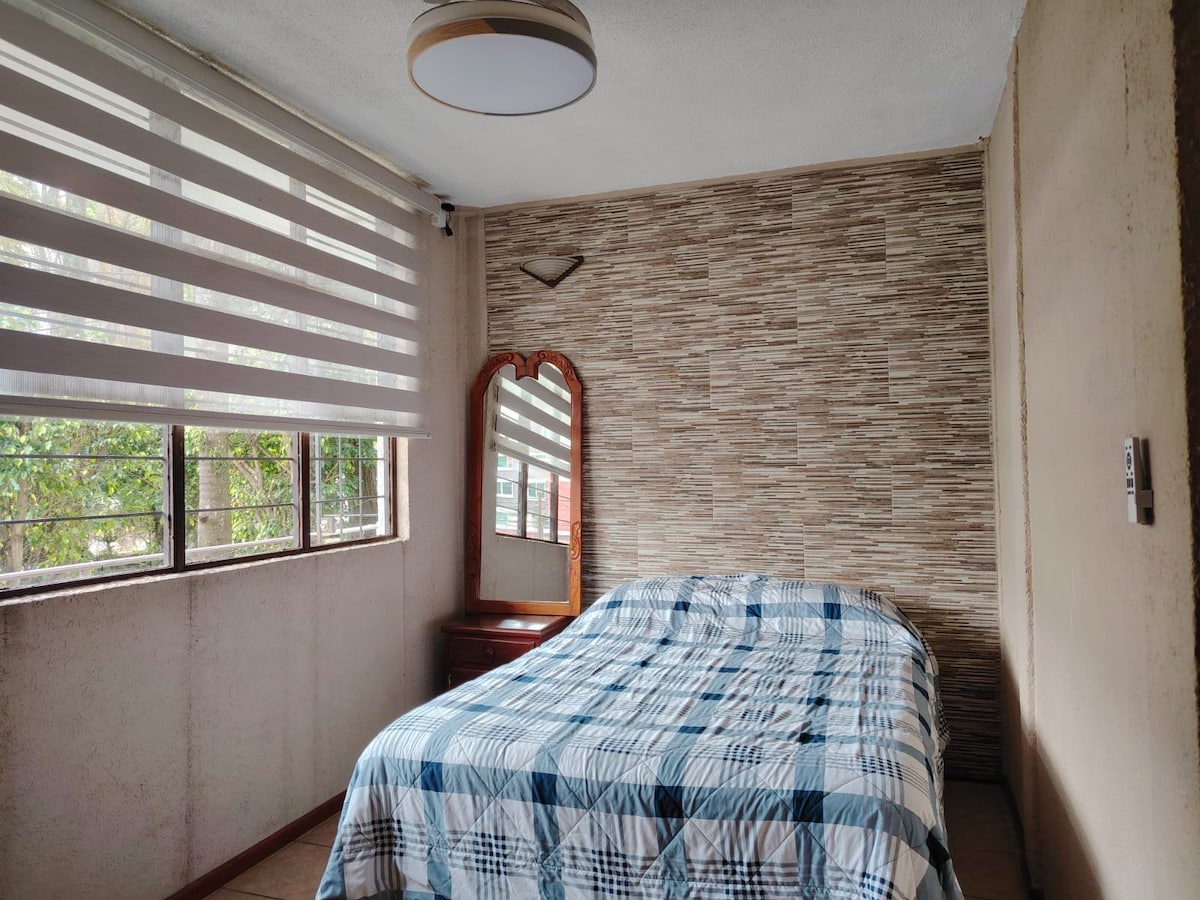 Acogedor y limpio departamento entero; tu familia estará cerca de todo, ya que es un alojamiento a dos cuadras del parque central de nuestro mágico Coatepec. Cuenta cómodamente con dos recámaras (una cama matrimonial en cada recámara), sala, comedor, cocina completa, baño y área de lavado. Ofrecemos el estacionamiento nocturno para un coche. Es ideal para autos y camionetas medianas.
