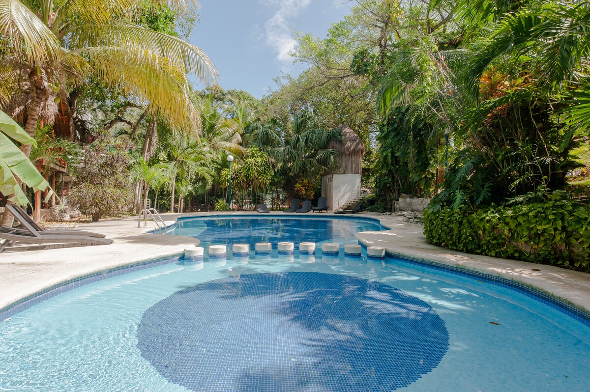 Spacious and comfortable Mexican colonial-style studio with fully equipped kitchen, 1 bathroom, satellite TV, and Wi-Fi. Relax in the cenote-style pool, enjoy another pool with palapa, chairs, and loungers, play on the tennis court, and take advantage of private beach access just 1 minute away. Perfect for couples, solo travelers, business travelers, or those seeking rest, combining comfort, exclusivity, and the best location in Playa del Carmen.