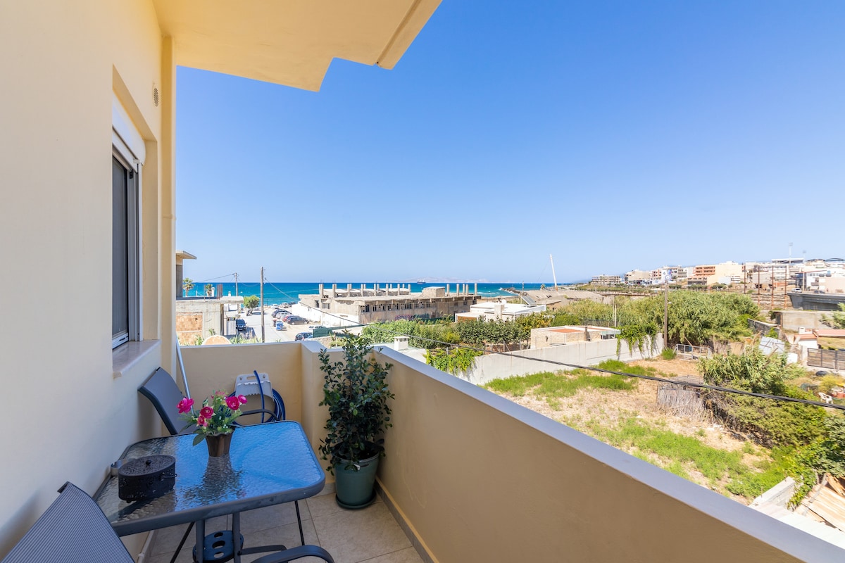Bask by the Beach in a Chic Apartment Overlooking the Sea. Enjoy breathtaking sunsets from this modern apartment just steps away from Ammoudara beach. Start your day with a swim or relax on the balcony with a sea view. Traditional Cretan lace and artwork add a touch of folklore to the stylish interior. The house is fully equipped with everything you need, including a kitchen and modern amenities like Wi-Fi, air conditioning, and a TV. Take a short drive og 10 minutes to Heraklion city center.