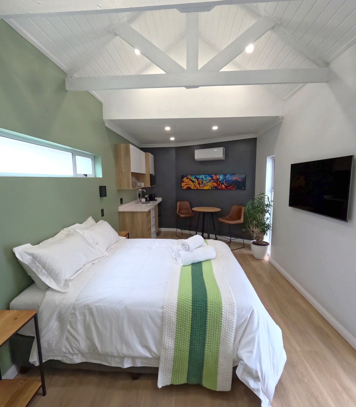 The Self-Catering Suite (65 m2) has unique wooden features to create that cosy look and feel. King size bed/twin beds with Egyptian cotton bedding. En-suite bathroom with bathtub and large shower. A full kitchen with a four-seater table and chairs. A comfortable seating area, sleeper’s couch, two 40 inch flatscreen TV’s, DStv, free high speed WiFi, work station/dressing table, hairdryer, air-conditioner, cupboard space , iron and ironing board, mini safe, swimming towels and a warm blanket.