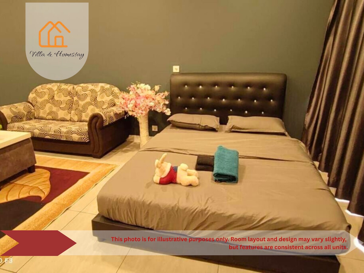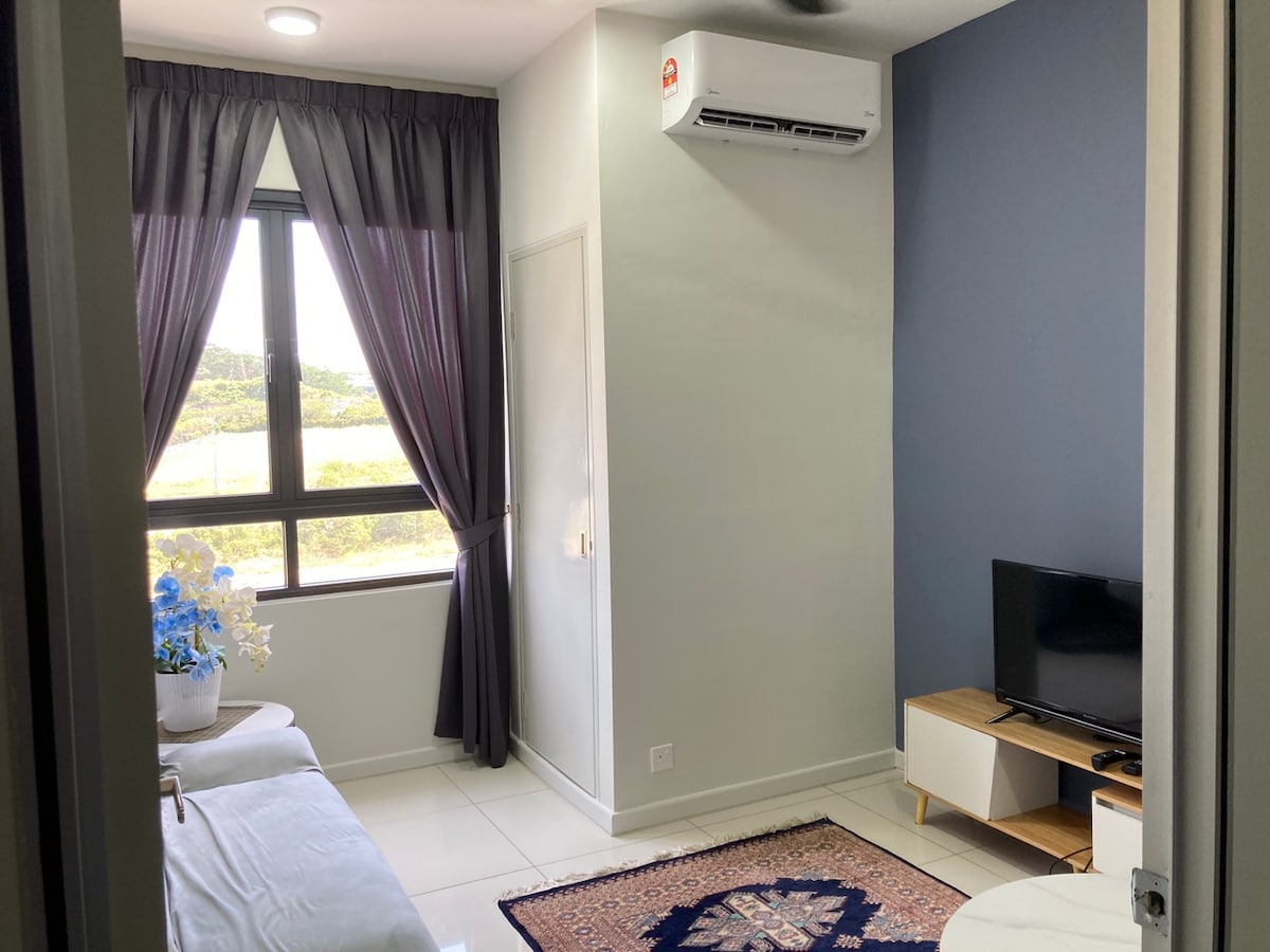 Explore our cozy studio, which can accommodate 2 to 3 people with a queen bed and a sofa bed. Only a 15-minute drive from KLIA T1/T2, the place is surrounded by many restaurants, fast food branches, groceries, and laundry shops, all within walking distance. Savor all the amenities, including the kids’ playground, BBQ area, gym, and swimming pool, with 24/7 security. * Unavailable drop your luggage before check in hours.Due to building designed, need to walk 10 steps staircase to get elevator.