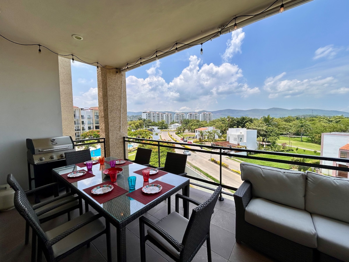 ☯️ Welcome ☯️ The apartment accommodates 6 people in Cluster 5, 4th floor, with a beautiful view and a peaceful atmosphere. It features 3 bedrooms, 2 full bathrooms, a fully equipped kitchen, air conditioning, and a terrace with a grill. Enjoy a swimming pool, tennis and padel courts, a golf course, and security. Just 5 minutes from supermarkets and restaurants. An ideal space to relax and vacation with family. We look forward to hosting you! 🌿