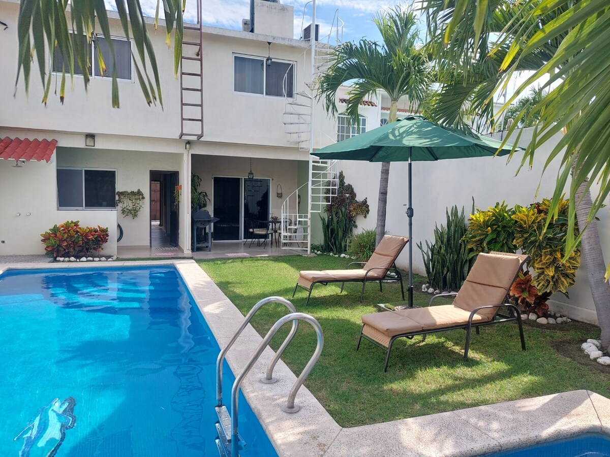 A 20 minutos del centro de Cuernavaca, totalmente equipada y muy confortable, cuenta con 2 habitaciones con Aire Acondicionado c/u, 2 baños completos y 1/2 baño en PB, terraza, comedor, cocina y patio de servicio, que harán de tus días una estancia cómoda y agradable. La privada cuenta con una piscina con chapoteadero (para los más pequeños), juegos infantiles y una palapa donde puedes pasar un día tranquilo con tu familia y/o amigos. ¡Bienvenido!