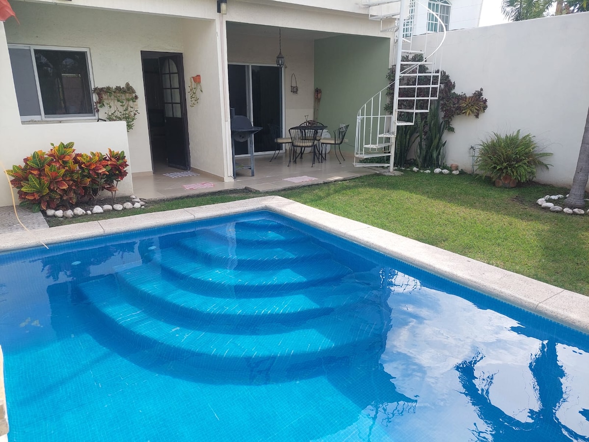 A 20 minutos del centro de Cuernavaca, totalmente equipada y muy confortable, cuenta con 2 habitaciones con Aire Acondicionado c/u, 2 baños completos y 1/2 baño en PB, terraza, comedor, cocina y patio de servicio, que harán de tus días una estancia cómoda y agradable. La privada cuenta con una piscina con chapoteadero (para los más pequeños), juegos infantiles y una palapa donde puedes pasar un día tranquilo con tu familia y/o amigos. ¡Bienvenido!