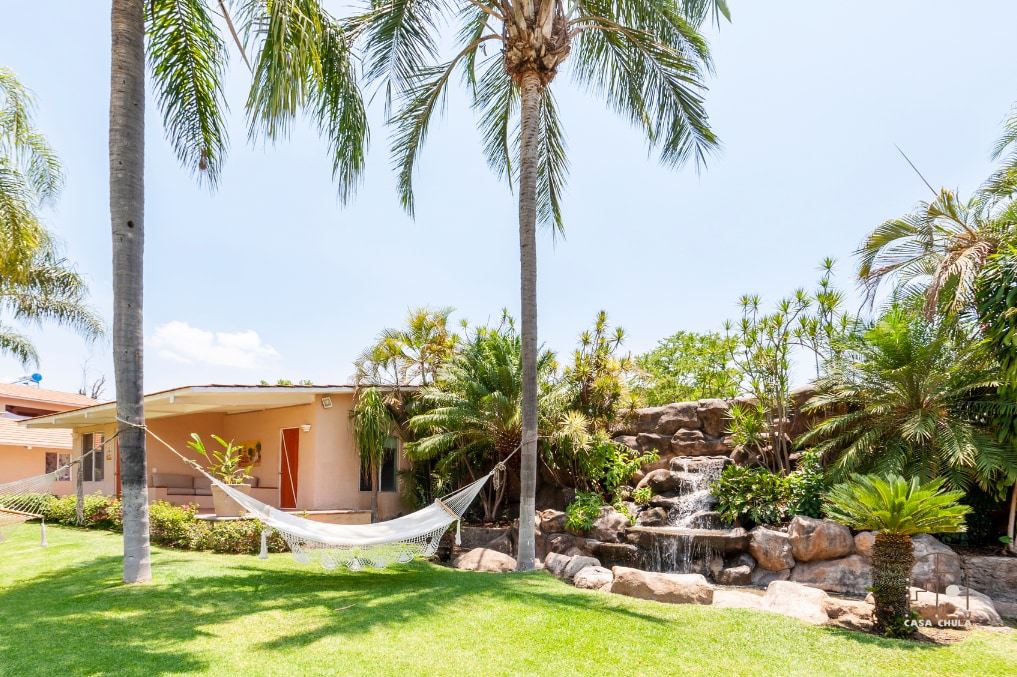La Caprichosa is an open-plan, country-style house with a beautiful garden and pool. It features a waterfall, hammocks, a bar, a paddle tennis court, space for 18 guests plus 4 more on futons, an outdoor grill, and a palapa. The house is excellent, offering a combination of spaces perfect for a great family weekend, a getaway with friends, or simply cooking and relaxing after a pool party. The most outstanding areas are the palapa, a living room for 9, a bar, and a dining room for 14.