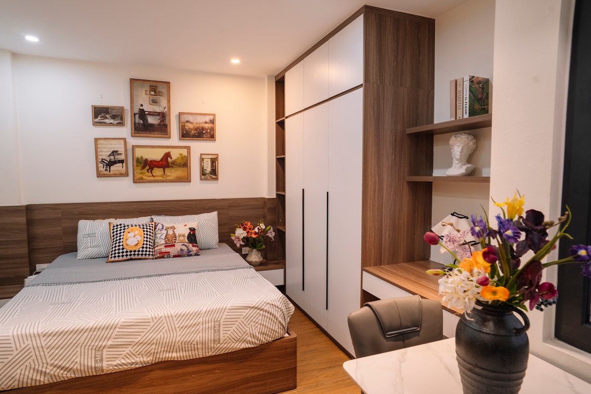A modern, cozy apartment just 5 minutes from West Lake. Quiet, secure, with a minimalist beige and natural wood design. Fully equipped: spacious bed, sofa, coffee table, large wardrobe, modern kitchen with fridge, induction stove, washing machine. Airy balcony with large glass doors for natural light. Only 10 minutes to a shopping center, perfect for entertainment. An ideal choice for a comfortable short- & long-term stay. SAMSAM Apartment is ready to welcome you!