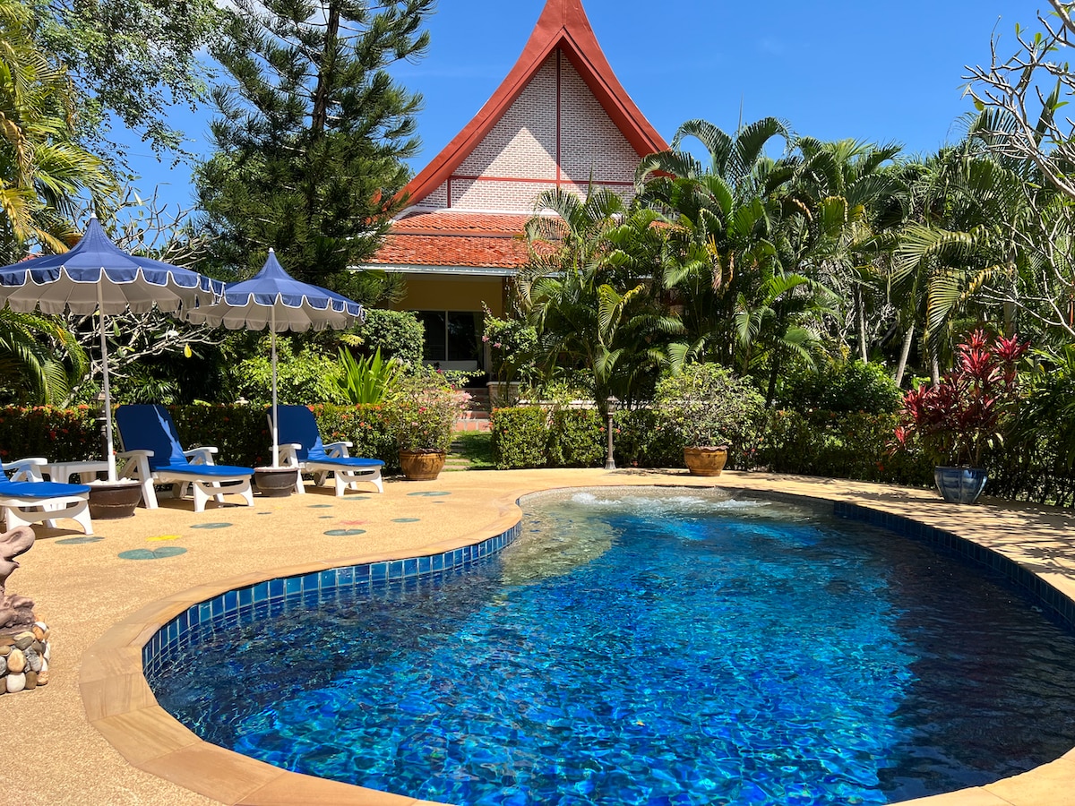 👫 Alan & Nuch invite you to our home; a tranquil villa nestled amidst lush tropical garden surrounding our large private swimming pool. 🏡 Our sole separate guesthouse is tastefully decorated in traditional Thai style, equipped with luxurious amenities for a comfortable stay, with no other guests on the property but us. 📌 Our location is safe and quiet yet conveniently close to beaches, restaurants, bars, shops, attractions and more. ⚠️ Please read all sections for important details !!