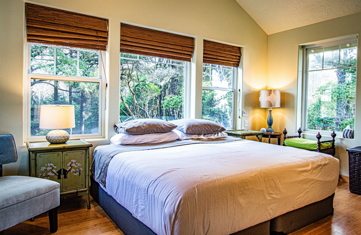 Tucked into a hillside forest this retreat features ocean, river and mountain views from every room. Ten minute walk to beach, river, coffee shops, restaurants, and supermarket. Far enough from the 101 so all you'll hear is crashing waves and trilling birds. Hiking trail right behind house leads to the famous 804 Trail, the Oregon Coast Trail, Amanda's Trail and Cape Perpetua.