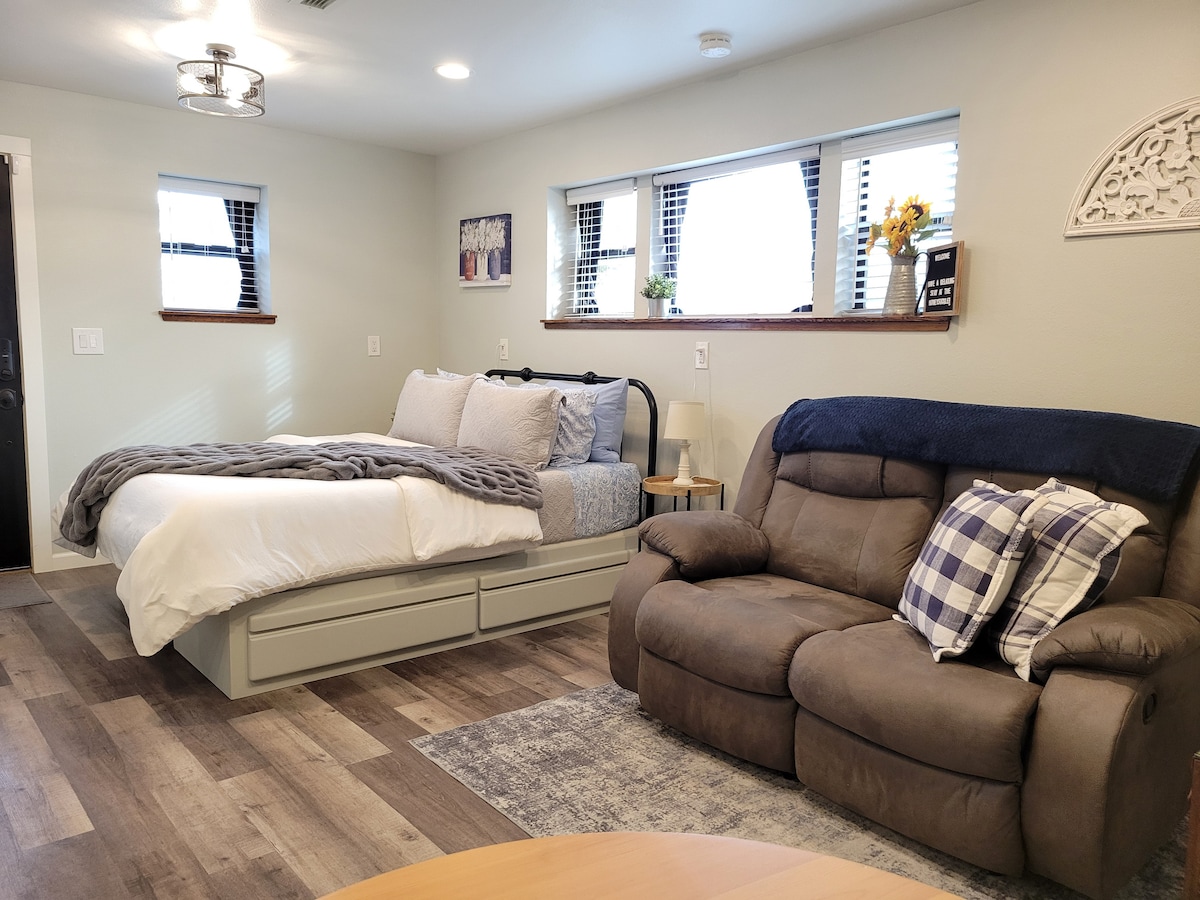 Relax in this cool, clean, modern Apt.B @"The Dive"by Bill's Place! (1 of 3 stunning apts.offered on Airbnb, check out C & A too!) Mix with the locals @ one of Yakima's oldest bars. Enjoy crafted cocktails, beer, wine & amazing food! (must be 21) No need to drive, Apt.B is next to 32 taps, top shelf bourbons & daily food specials! 2 blocks from downtown & free parking! Enjoy a 65"TV w/free unrestricted WiFi w/Starlink, Q bed, desk, full kitchen, mini splits, conv.sofa & patio. Come dive in!