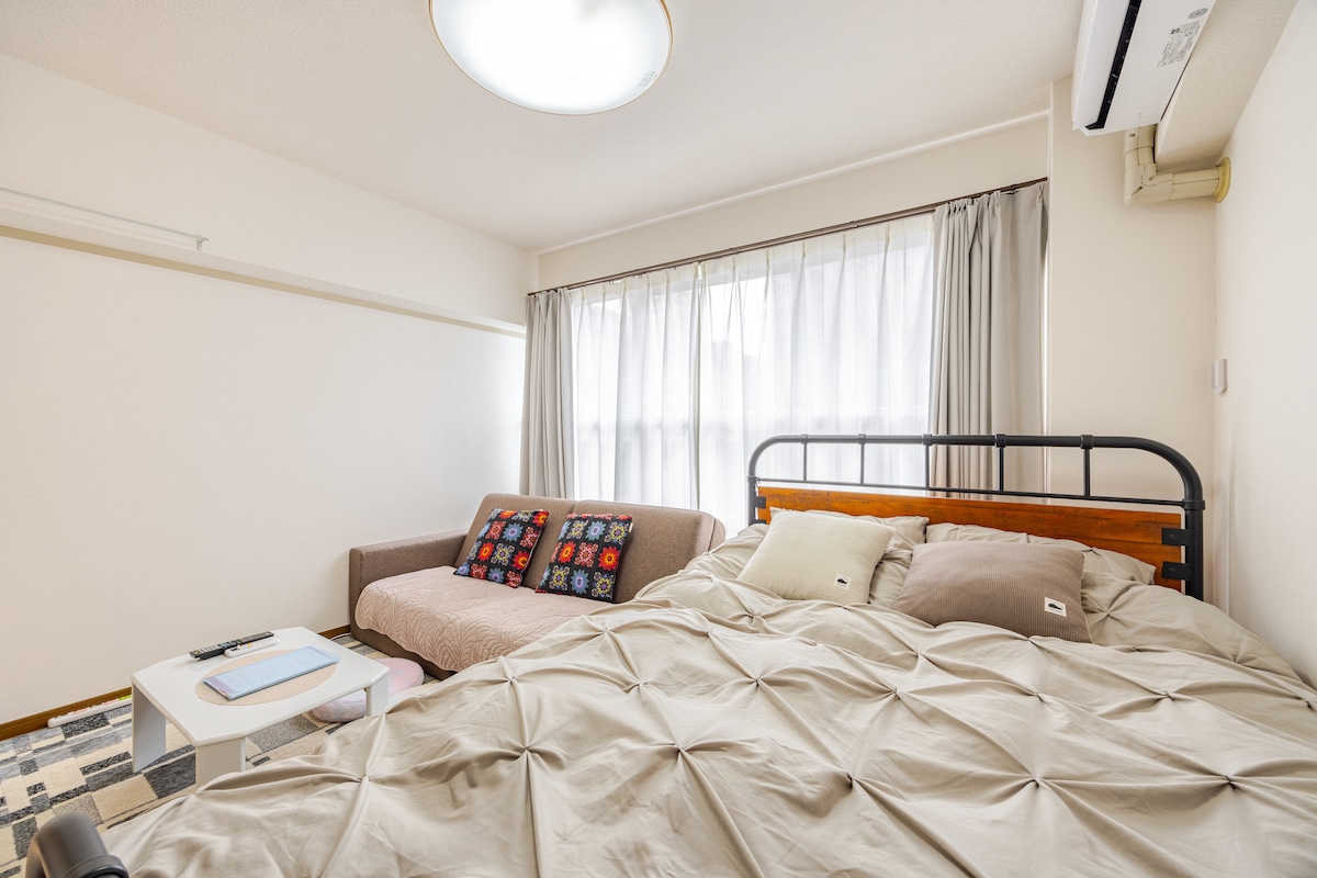 距离福冈「地铁天神站」步行5分钟。改建的公寓房间。1张双人床和1张沙发床。