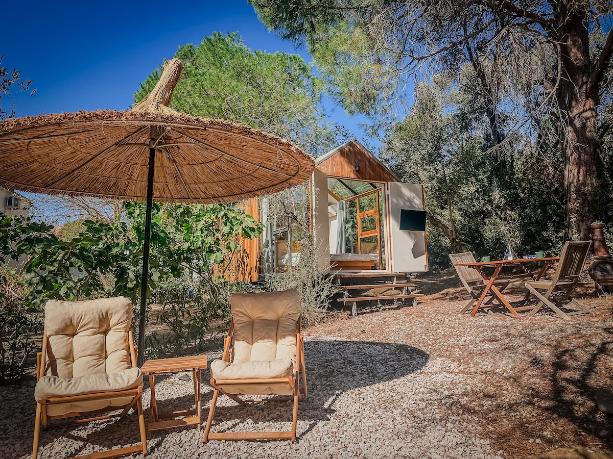A small but magical hideaway for those seeking silence and peace away from the city. Located in the heart of nature on the Dereköy side of Bodrum, this house is entirely yours. Days pass with the warmth of the sun, and nights with the crackle of fire. Your Experience: Warm hot tub moments under the stars Cozy conversations by the fireplace, wrapped in a blanket Complete silence, broken only by the sound of birds, wind, or rain Wooden textures, soft lights, and a peaceful atmosphere