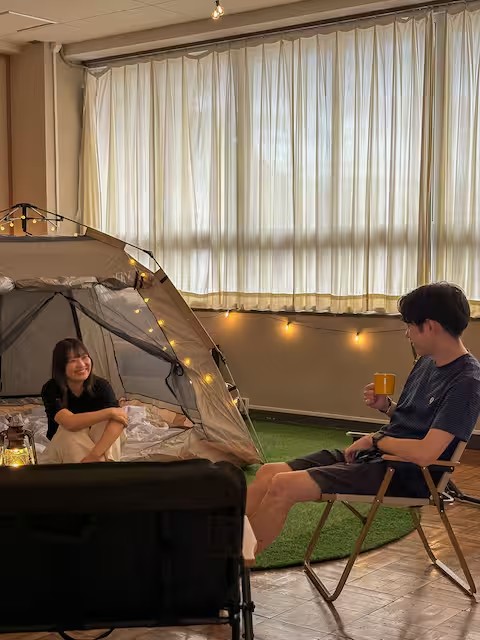 星空の下で焚き火をして、小学校にお泊まり。 そんなエモい夜を過ごしませんか? 【4名までのグループ向け】教室グランピング 山形県米沢市にある、かつて小学校だった校舎を活かした宿泊施設です。 教室が、特別なグランピング部屋に変身! シングルベッドのマットレスが4台あり、家族やカップル、親しい友達との思い出づくりにぴったり。 男女共用のラウンジでは、鍋パーティー、プロジェクターで映画やゲーム、飲み会も自由に楽しめます。 さらに車で5分の天然温泉街で癒され、夜は星空のもとで焚き火を囲みながら語らう時間も。 特別な一夜をお過ごしください。 ▼ 現地で追加購入・利用いただけるもの 【設備】 ■ シャワー室 ■ コインランドリー ■ コインロッカー ■ 冷蔵庫 ■ 小学校の机&椅子 ■ 無人ファミマ(アメニティや衣類、菓子、チルド食品など) 【レンタル】 ■ 運動会セット ■ 自転車 ■ Switch 2 ■ プロジェクタ ■ BBQ&焚き火セット ■ たこ焼きセット