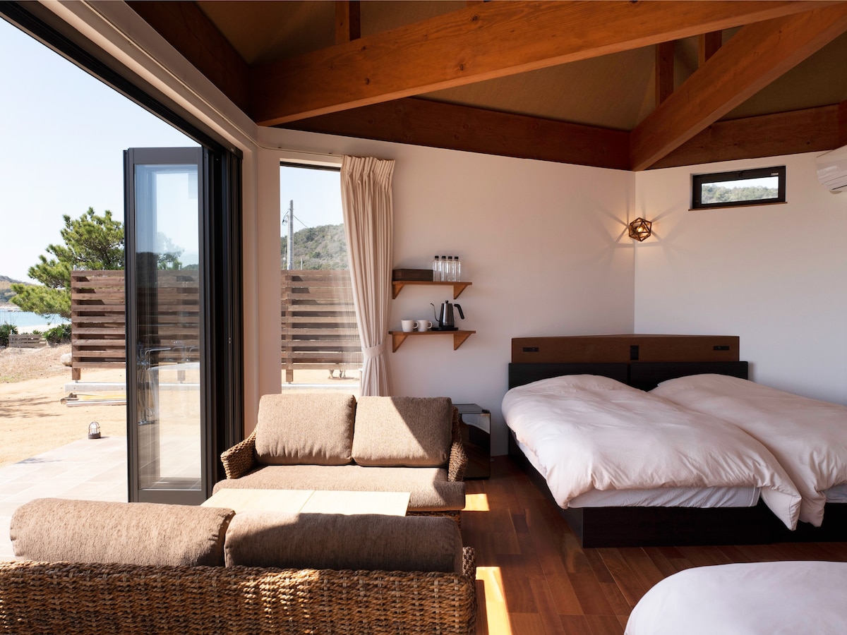 日の出の絶景 目の前は穏やかな瀬戸の海 晴れた日には遠くに四国が見え その前を小さくなった貨物線が通って行きます。 潮騒をBGMに ここでしか味わえない至福の島時間を ご家族、大切なお仲間、恋人と Beachfront Cabinでご堪能ください。 Beachfront Cabinは静かな海辺にある一棟貸しのログハウスです。プライベート空間としておくつろぎいただけます。小さなお子様連れのご家族も周りに気兼ねすることなく、ご利用、お楽しみいただけます。 このキャビンの魅力の1つはサウナです。 一日の遊び疲れた身体をリフレッシュしてくれます。海を見ながら整い、乾いた喉を潤す冷えたビールは格別です。 近くには広島の世界遺産「厳島神社」の分社もあり、隠れた観光スポットになっています。 また、Wi-Fiを完備していますので、潮騒をBGMにテレワークにも最適です。 皆様のご利用お待ちしております。
