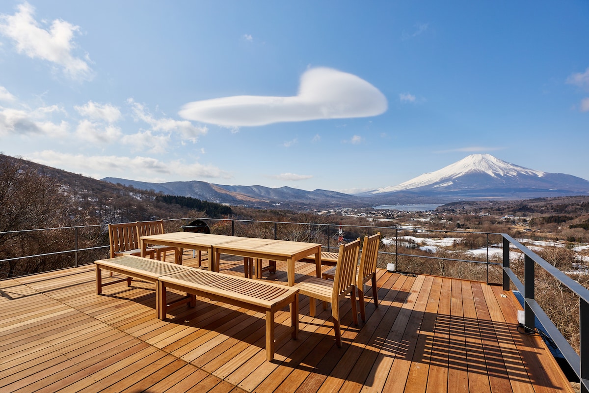 別荘地頂上の絶景富士山、BBQ、薪ストーブ、貸切138㎡、山中湖IC20分、河口湖IC30分、車3台