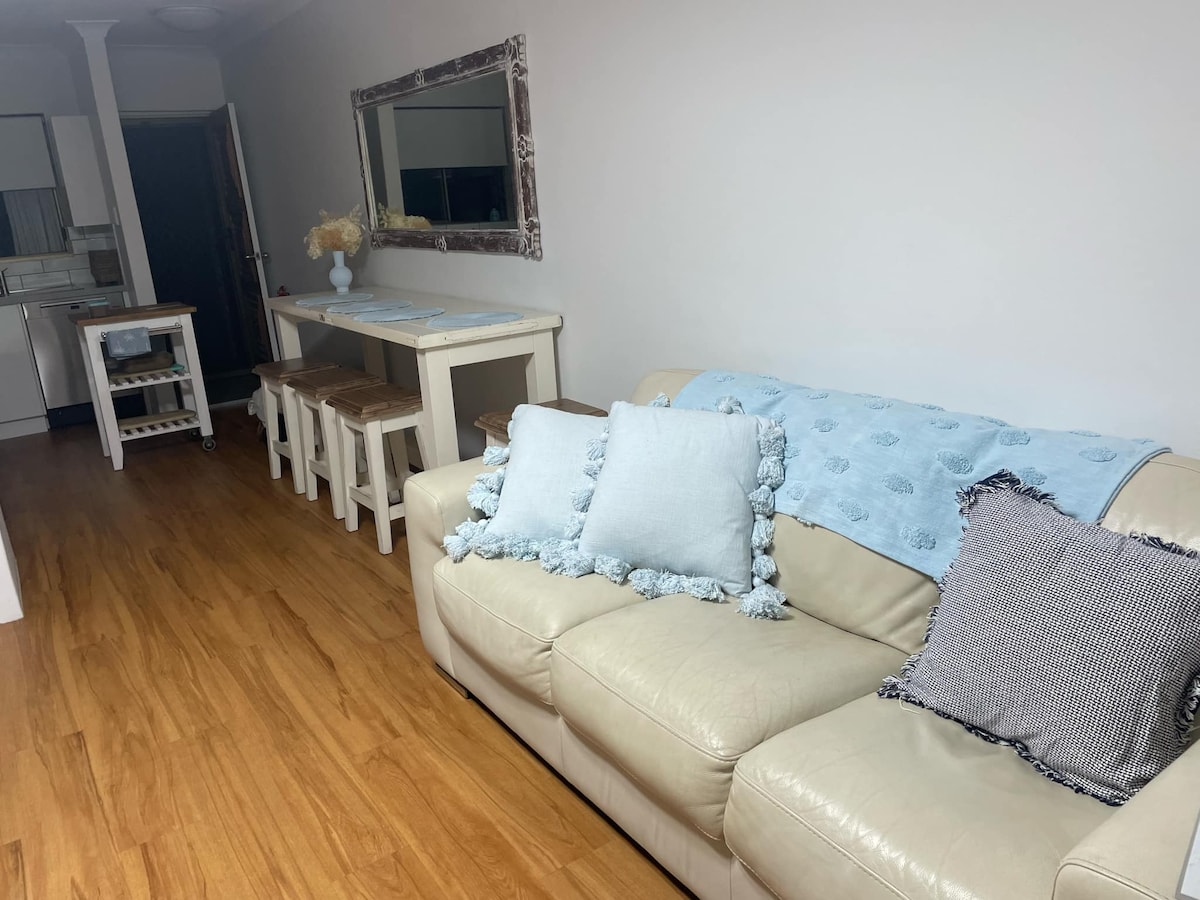Enjoy soothing ocean sounds (beach just 50 meters away). Kick back and relax in this calm, stylish space. Takeaway & corner store 150-meter away, coffee van, pub (courtsey bus home) is 850-meters away,. All the dining options in Woolgoolga are just a 10-minute drive away. Explore the stunning coastline, or simply unwind in this quiet coastal town. Breathe in the salty air and fall asleep to the sound of the waves. Beach access 200m, Sleeps 5 people, with a trundle available under the queen bed.