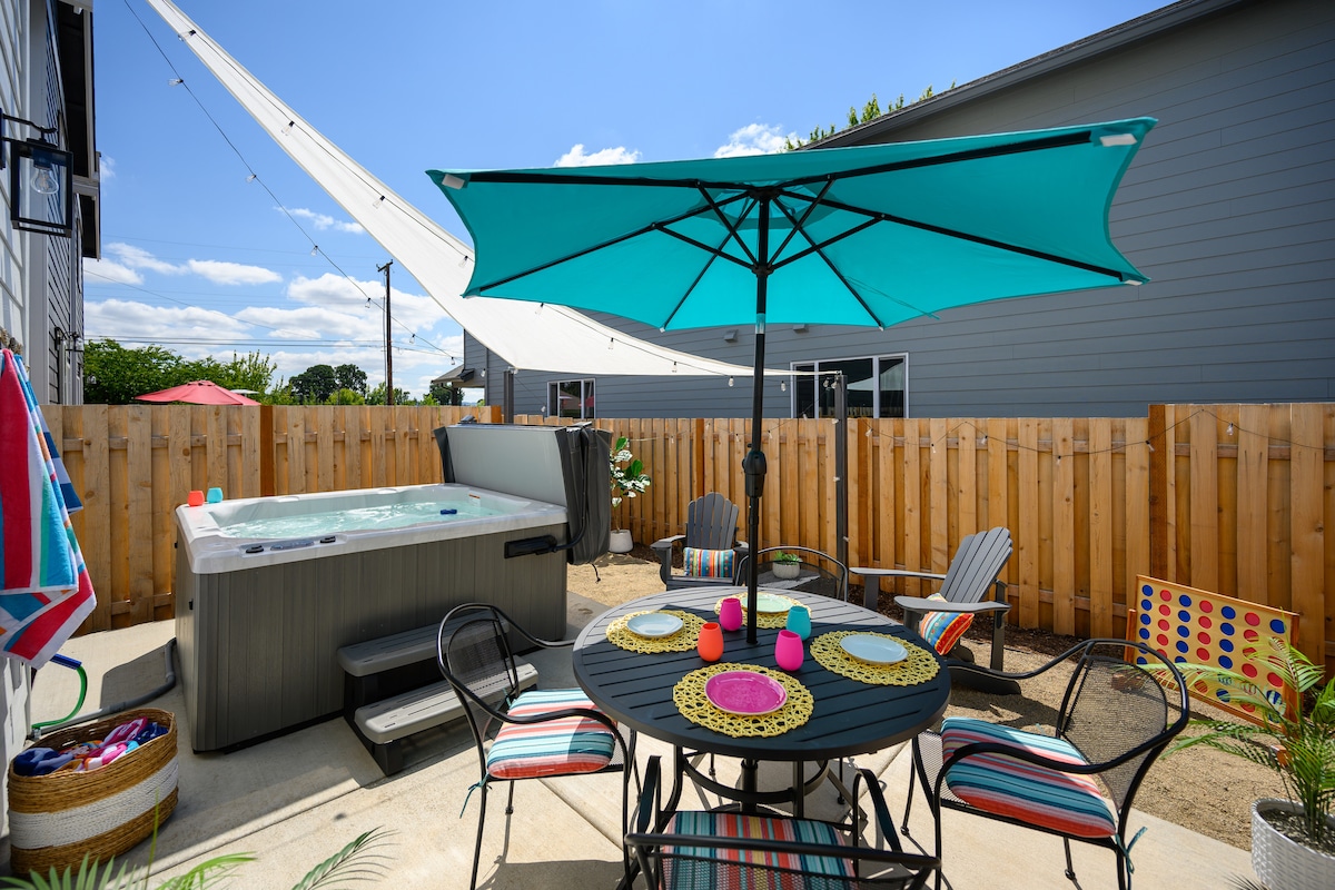 Come enjoy this cozy space. It has been set up with you in mind. Each room has new, clean furnishings. Bring along children or a dog to enjoy the big back yard (see house rules re: dogs); hot tub with family and friends; play, cook, and rest well. Centrally located in the Willamette Valley, a walk or e-bike ride into town where you can enjoy a flavorful meal or linger at some of the best wineries in the Pacific NW. We are a short drive to the Oregon Coast, the Columbia River George and Mt Hood.