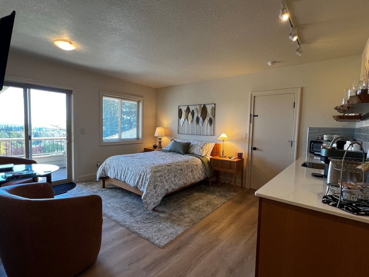 Welcome to our cozy studio apartment, a refined and serene sanctuary nestled amid the beauty of Oregon's Willamette Valley wine country. This elegant, generously proportioned suite offers a full private bathroom and a fully equipped kitchenette, thoughtfully designed for comfort and convenience during your stay. The apartment sits on our 10-acre hobby farm at the end of a mile-long lane bordered by hazelnut trees, vineyards, and pastures—giving you a quiet, private spot surrounded by nature.