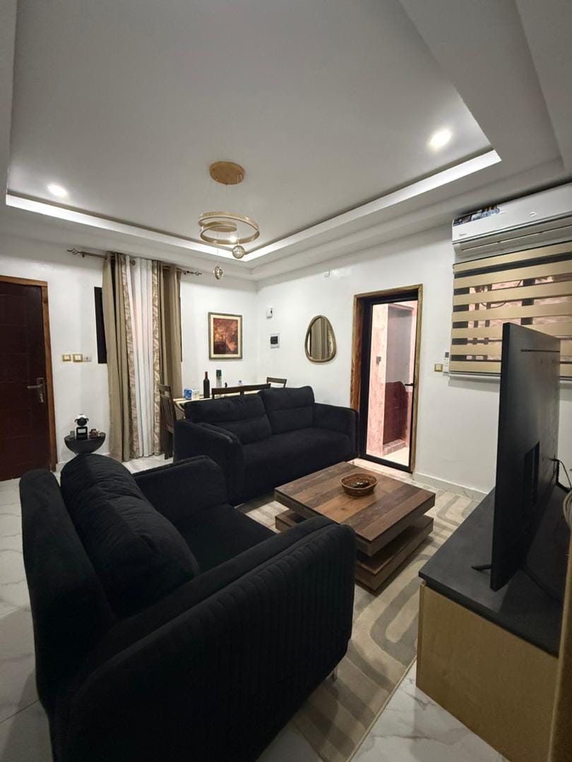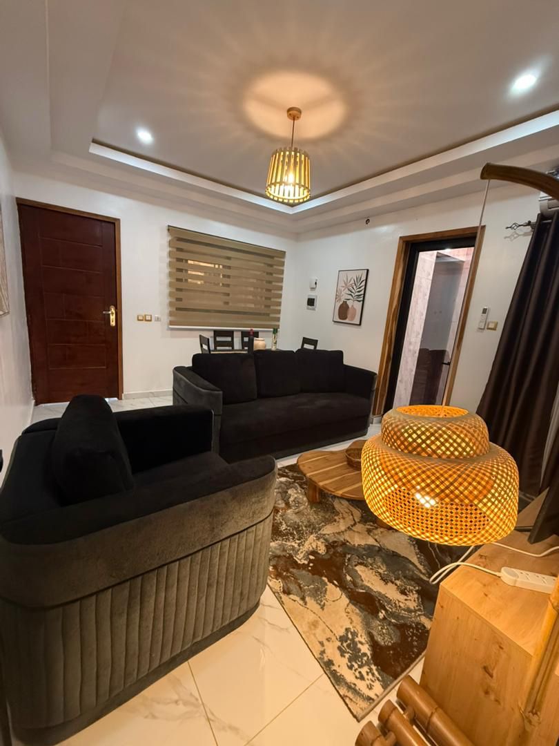 Welcome to this stylish, fully furnished 2-bedroom apartment in the heart of Yamoussoukro. The living area features sleek black sofas and a large TV for relaxing evenings. The space is bright with modern ceiling lighting and elegant curtains, creating a warm and inviting atmosphere. Ideal for families or solo travelers, the apartment offers all the amenities you need for a pleasant stay. Enjoy a peaceful experience in this beautifully decorated home, perfect for both vacation and business trips.
