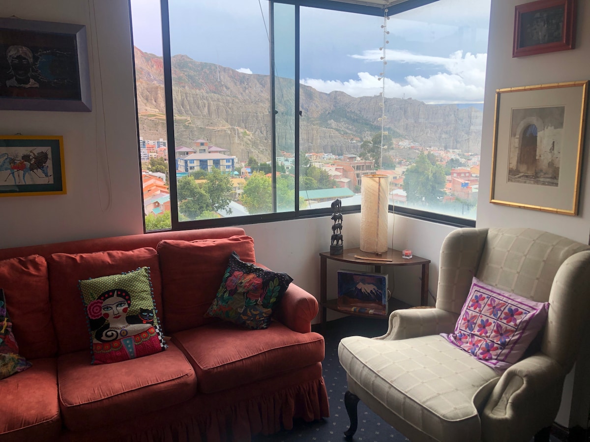 Relax in this cozy 1-bedroom apartment, located in Achumani, one of the most beautiful and peaceful areas of La Paz. Situated right in front of a lovely park, it also offers a privileged view of the city. The apartment features 2 bathrooms (main and guests), equipped with smart home technology, including Alexa, to make your stay more comfortable. Just steps away you’ll find supermarkets, pharmacies, ATMs, banks, restaurants, and—right across the avenue—easy access to public transportation.