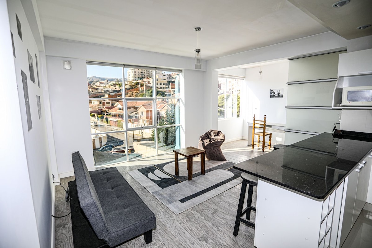 Step into a modern, inviting studio designed for both relaxation and productivity. This brand-new space features a large desk complete with a PC screen, keyboard, and mouse—perfect for remote work or study. Enjoy cooking in the fully equipped kitchen and unwind in warmth with two heaters, ideal for La Paz weather. A cozy retreat ideal for travelers seeking comfort, style, and a functional workspace. The building has a BBQ terrace with a beautiful skyline view, outdoor and indoor areas.