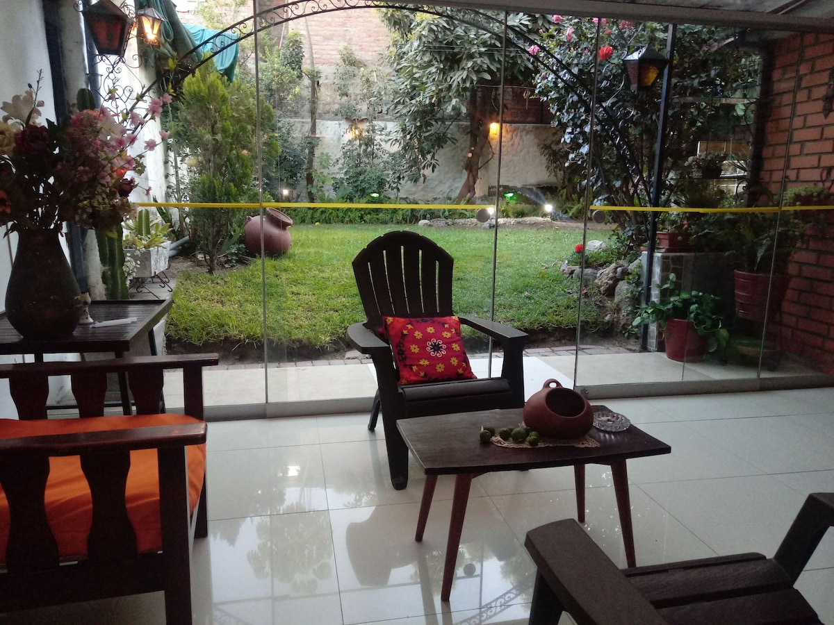 Desde este alojamiento céntrico podrán disfrutar del fácil acceso a todo. Contamos con un jardín muy grande y lindo dónde podrás compartir de lindas tardes! Hay zona de fogata y zona de parrilla, para que disfrutes en casa tambn. Hay una huerta que puedes utilizar! Tenemos cochera privada y gratuita! Tendrás cocina y baño privado con agua calientita!! También contamos con servicios adicionales cómo salida a roca (escalada) y rafting para que tú estadía sea más chevere :)