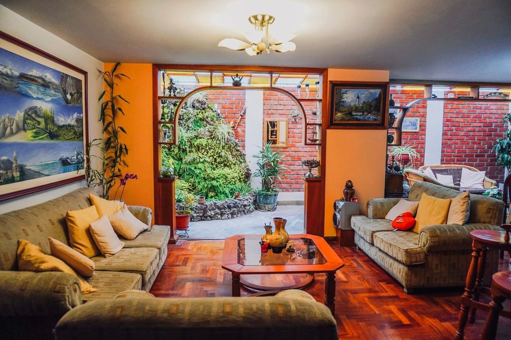 Relax in a spacious family room with an outdoor sitting area, perfect for soaking up the sun. This cozy double room with an extra single bed (fits 3 people) is on the ground floor in central Arequipa, in a quiet, safe area. Enjoy an ensuite private bathroom, a fridge for personal use, and upstairs a fully equipped kitchen. Easy access to nearby attractions: 10-min walk to Plaza de Armas, 7 min to Monasterio de Santa Catalina, and 3 min to San Lázaro, shops, and restaurants.