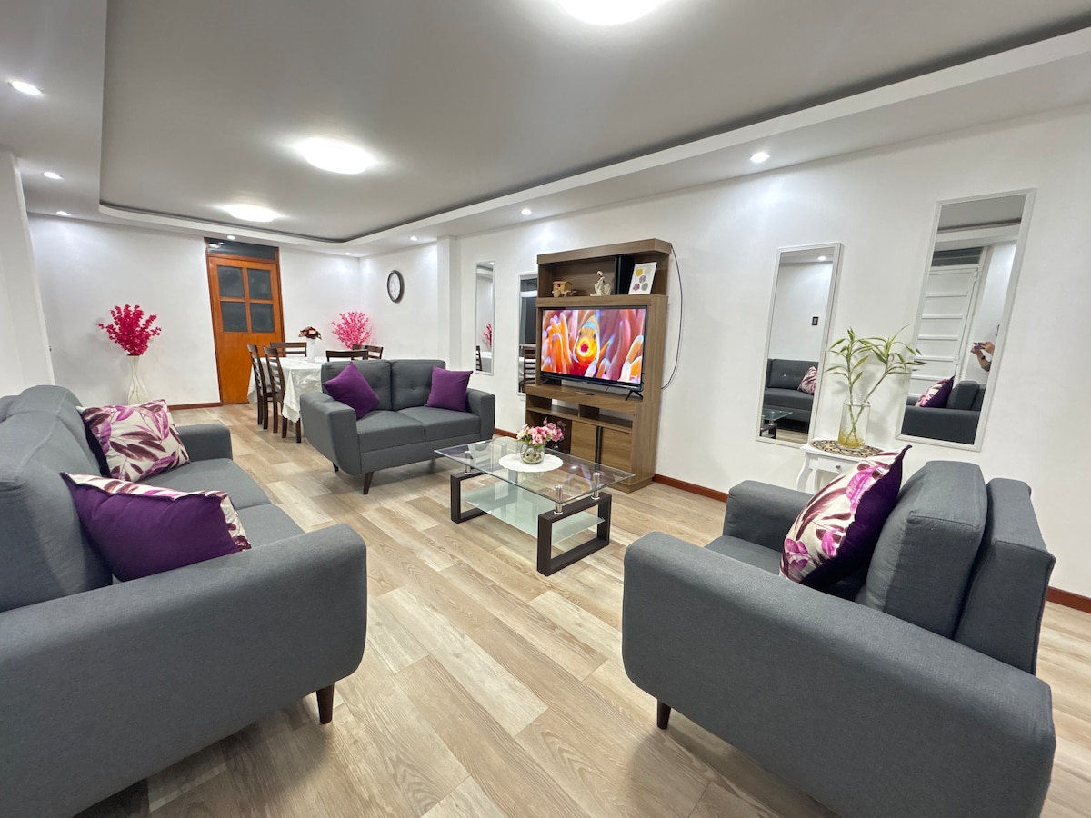Consta de una sala con TV de 65” NETFLIX para su total distracción, además tiene un equipo de sonido para su comodidad. Un comedor, una cocina equipada con artefactos y menajeria completa para su estadía. Tiene tres dormitorios c/u cama 2 plazas, televisores Smart en c/u y mesas con sillas, con ropero empotrado uno de ellos tiene un baño privado y los otros 2 con baño compartido. Cuenta con cochera. Tiene agua caliente todo el día y una buena señal de WIFI. Cuenta con acabados de primera.