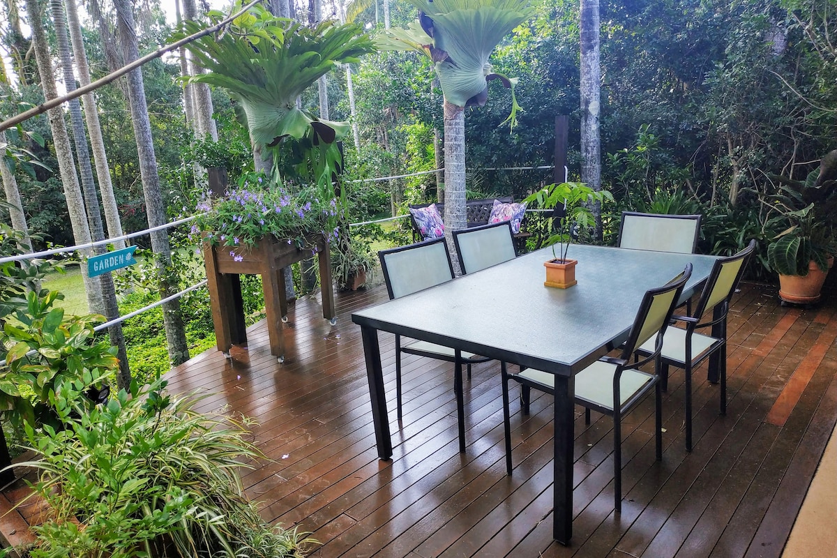Cosy, quaint and relaxing,"Noreen's Nest" is a self-contained studio nestled between the Coast and Hinterland - an affordable option for those who crave a country ambience just 20 mins. from the closest beach. You'll enjoy a deck under a natural canopy of palms and staghorns, and most likely our resident kangaroos will be sighted by animal-loving guests. You'll awaken to the natural cacophony of seasonal birds. FREE: 100 Mbps NBN Wi-Fi for work, PLUS smart TV with home theatre for entertainment.