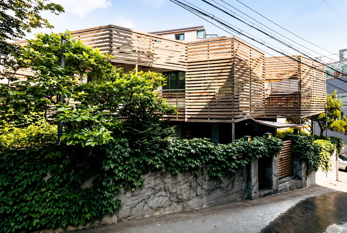 홍대입구역 도심에 위치한 정원과 바베큐 테라스가 있는 프리미엄 디자이너 하우스 CASA Living, MARU, SBS Morning Wide에 소개된 이 특별한 집은 이탈리아 디자인 스튜디오 Elastico의 디자이너 시모네 카레나 & 마르코 부르노가 한국 전통 한옥의 구조와 문화를 현대적으로 재해석하여 설계한 공간 담쟁이덩굴이 감싼 정원, 서울 한가운데서도 사계절의 자연을 느낄 수 있는 도심 속 힐링 공간을 경험 가능 벽난로가 있는 고급스러운 거실에서는 빔프로젝터로 영화를 감상할 수 있으며 침실에는 5성급 호텔 수준의 프리미엄 구스다운 침구(95% 이상) 완비 홍대의 감각적인 카페, 레스토랑, 갤러리와 가까우면서도 번잡함에서 살짝 벗어난 조용한 주택가에 위치한 프리미엄 숙소 12년 연속 슈퍼호스트가 운영하는 숙소로 청결, 관리, 서비스에 있어 최고의 만족도를 유지 4박 이상 예약 고객 무료 공항 픽업 서비스 제공 5박 이상 예약 고객 서울 프라이빗 투어 경험 무료 제공