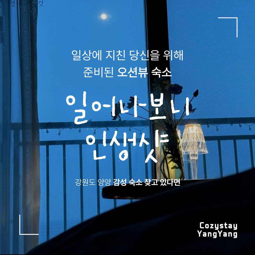 - 게스트 후기 최다 내용 3가지:최고의 일출뷰,깨끗한 방,친절한 호스트입니다 - 4계절 침대와 테라스에서 완벽한 일출 감상과 파멍 가능한 아름다운 곳입니다. - 방 컨디션 믿고 예약 가능한 곳입니다 -워케이션 명소입니다 - 인스타 lets_go_yangyang (양양가자)에 많은 관심과 DM바랍니다. - 간단한 음식을 드실 수 있는 주방 도구가 갖추어진 레지던스 호텔입니다. - 얼리 체크인, 레이트 체크 아웃시 추가 금액 시간당 1만원씩 적용됩니다. (유연성 있음) - 호스트가 청소, 운영을 직접하는 숙소로 양양가자 1호도 있습니다. - 기본 투숙객 2인으로 추가 1인당 3만원입니다. -강릉과 속초 중간 지점에 숙소가 위치해 있습니다.여행 계획에 참고 하세용 -차별화 된 스마트 TV로 넷플,쿠플시청가능(계정제공) -셀프체크인