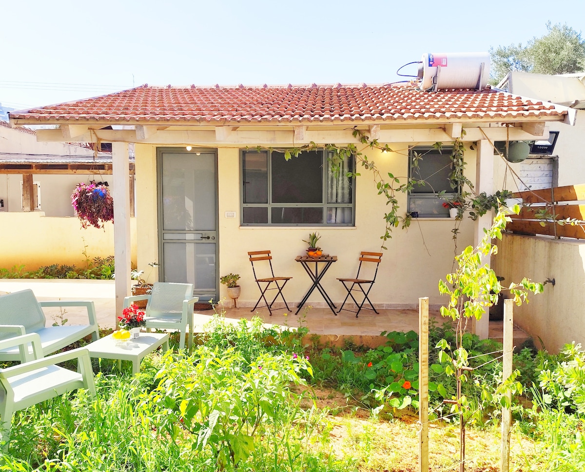 This is an enchanting guesthouse, well sized and furnished, located in the heart of the lovely Sharon region, just a few Kilometers from the mediterranean sea. Outside you can enjoy the beautiful private garden where you can have breakfast accompanied with chirping birds or dinner with candles and moonlight, afterwards you can use your private, romantic hot tub or enjoy the pool in the front garden. We also have free parking. The entire place is completely private and only yours!