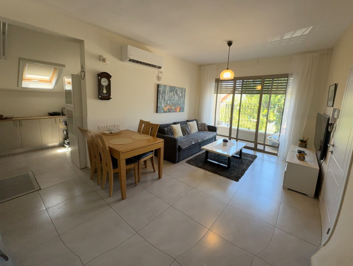 New and cosy 3 rooms upper unit. The unit contains a living room with a sofa, t.v and dining table. The kitchen is fully equipped. The main bedrooms has a dabble bad and closets. The second bedroom contains a single bad which opens. The working area is located in the second bedroom. The unit has two beautiful balconies. All rooms are air conditioned. The unit is beautifully designed and perfect for a vacation, business trip etc.