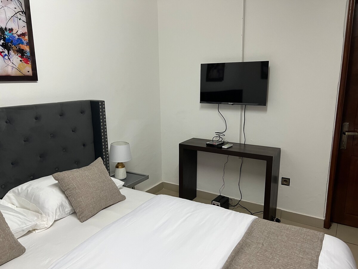 This apartment located in a heart of one of a high standing city in Yaounde, here you will find all commodities around and easy to access . This fully furnished apartment has a big parking with cameras.