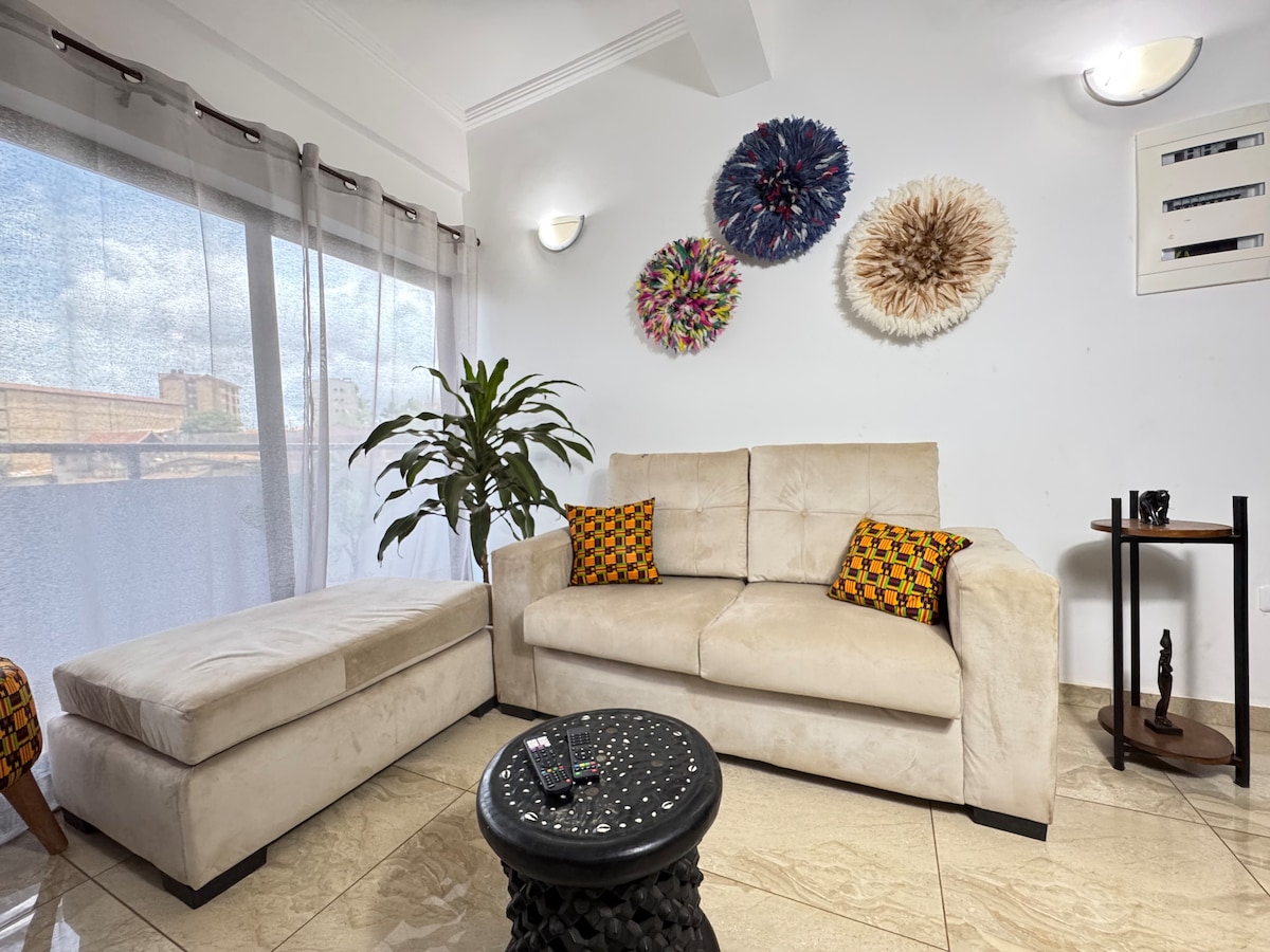 Bienvenue à Parenthèse Ashanti Un appartement chic et apaisant, inspiré par l’élégance intemporelle du Royaume Ashanti. Parfait pour une halte raffinée à Yaoundé, il marie art, confort et praticité : une chambre confortable, un salon lumineux, une cuisine entièrement équipée, un wifi haut débit et un service attentif. Offrez-vous une parenthèse culturelle et contemporaine dans un cadre chaleureux et inspirant, propice à la détente comme au travail.