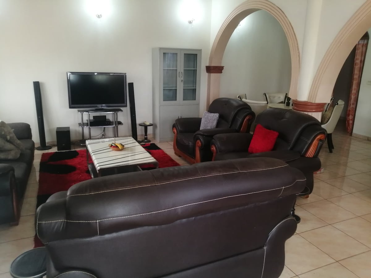 Bring the whole family to this stylish and spacious place with lots of room for fun. Take out a room and lounge, or a whole house: lounge, dining room, kitchen, 3 bedrooms, 4 bathrooms, two balconies, patio, for a bargain price. With WIFI, cable, Netflix, air-conditioning, Washing machine, and safe, gated ample parking, this affordable home is waiting to welcome you. Situated at Odza, Yaounde.