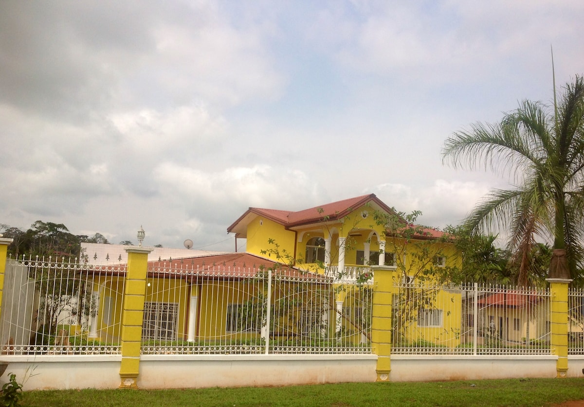 Pour votre séjour à Yaoundé, profitez d'une villa franco-camerounaise, spacieuse et confortable. Equipée de meubles et matériel de qualité, vous vous sentirez comme chez vous. Parking, terrasse, concierge, etc... Possibilité d'une location de voiture avec chauffeur. Villa idéale pour vos déplacements professionnels ou vos vacances au Cameroun. Nous serons heureux de vous accueillir et notre concierge sera là pour vous guider.